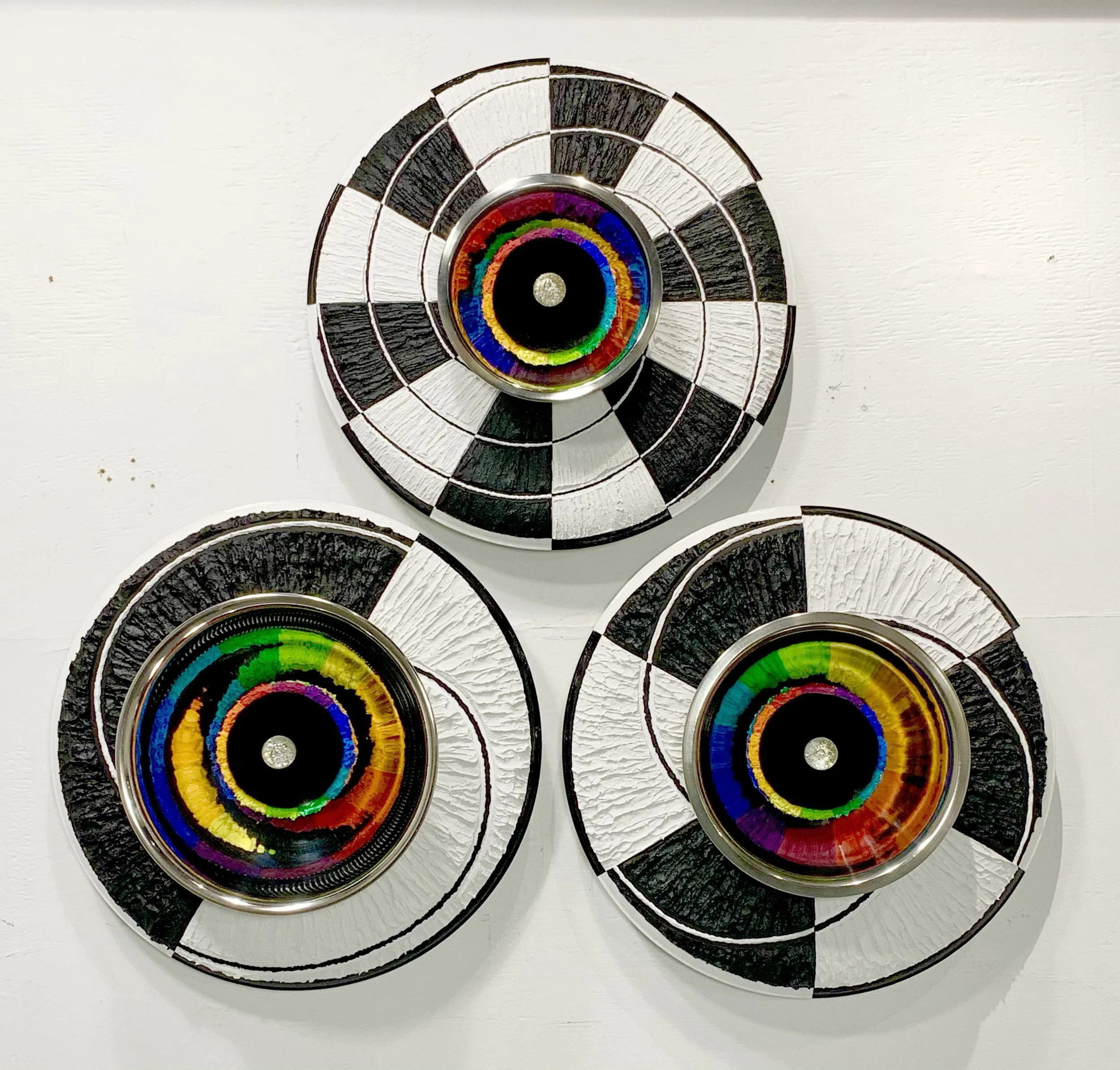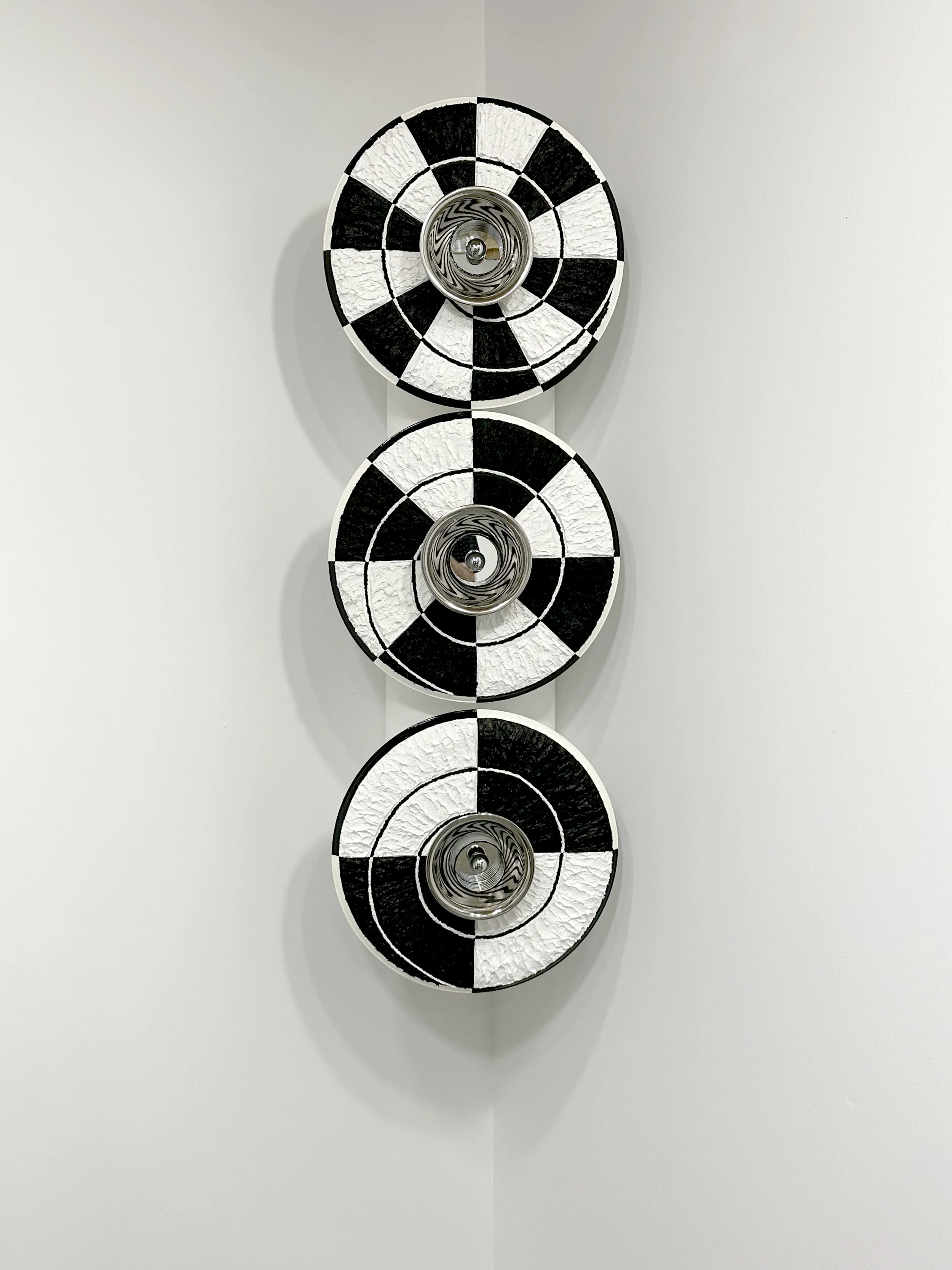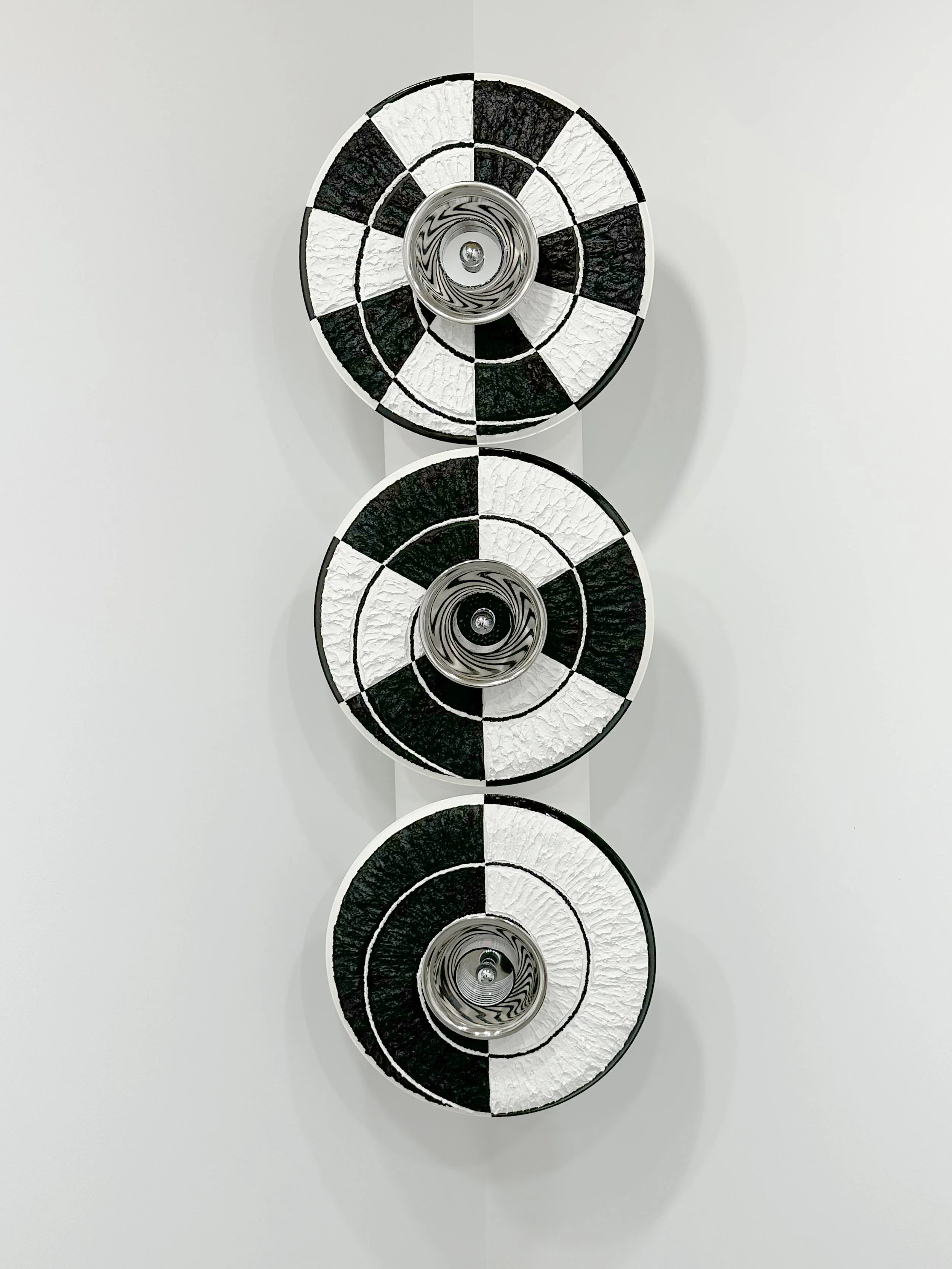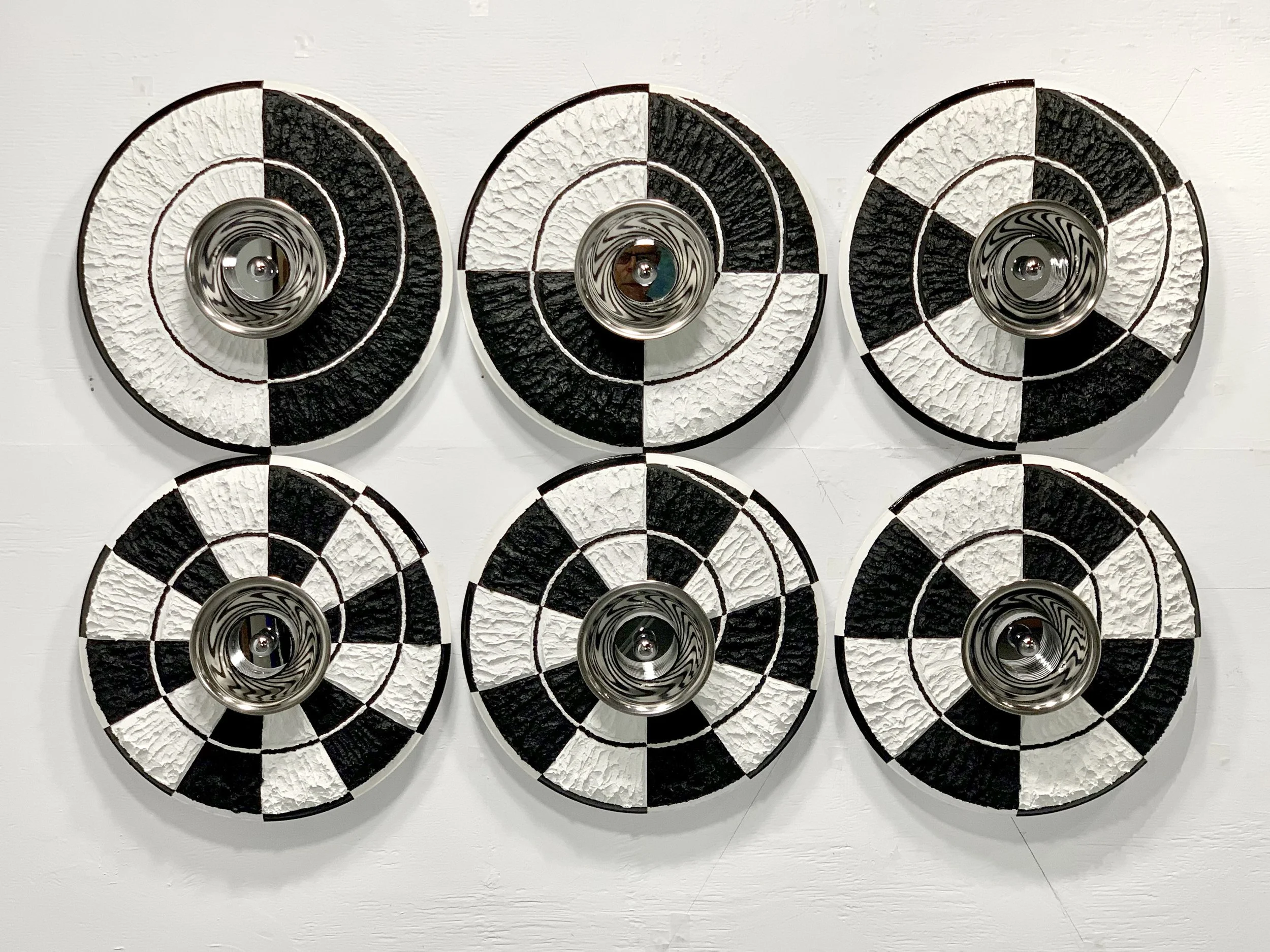 bowls, tubes, paper collage, mirrors, plastic trays, chrome knobs