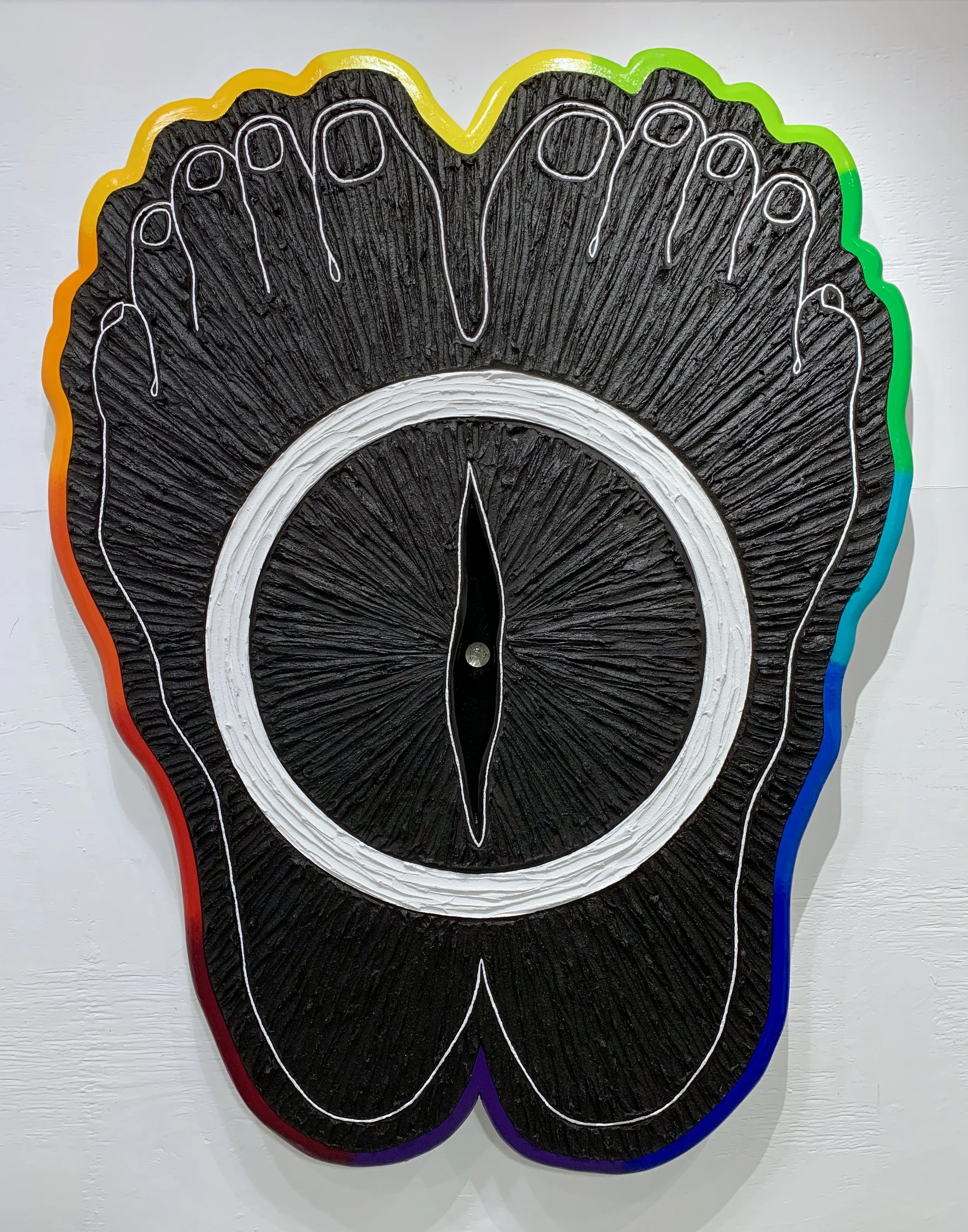 Acrylic paint, gels, texturing materials, varnish, outdoor carpet,